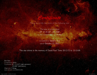 This star shines in the memory of David Paul Toms 18-12-72 to 13-10-99